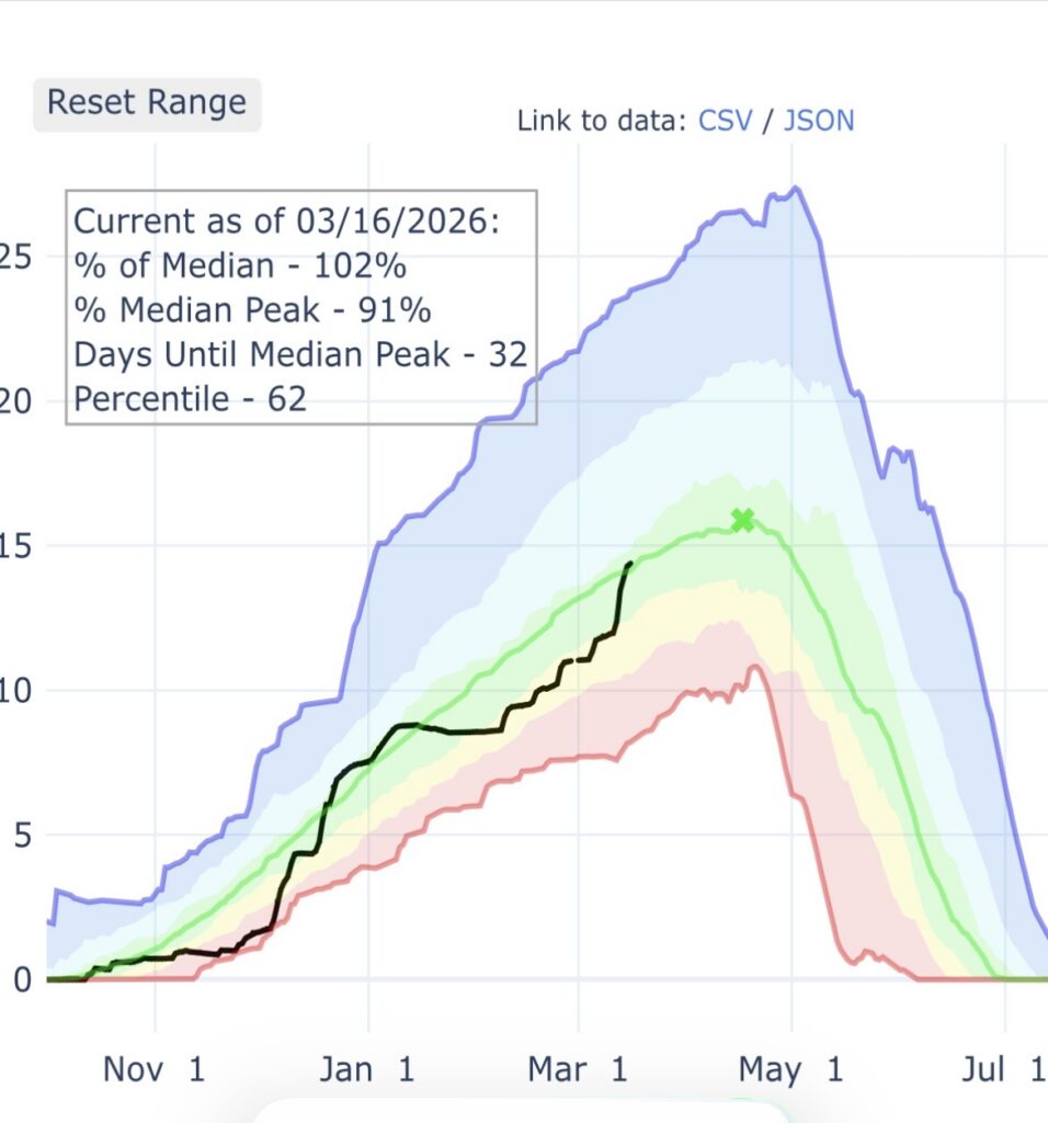 The below graph shows the % of median snow water currently in the Big Hole drainage. We are currently showing 102%. The green line is the 25 year average and the black line is the 2026 snowpack. In the next 30 days we have a chance to exceed the long term average snowpack, which is fantastic news!